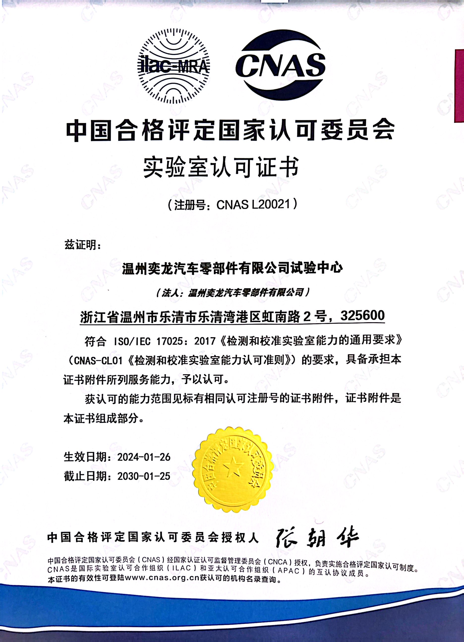 实验室认可证书